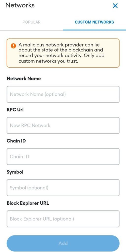 برای افزودن شبکه به صورت دستی مجددا به قسمت شبکههای کیف پول رفته و روی گزینه Add a network بزنید. در ادامه وارد تب Custom Networks شوید که صفحه زیر نمایش داده میشود.