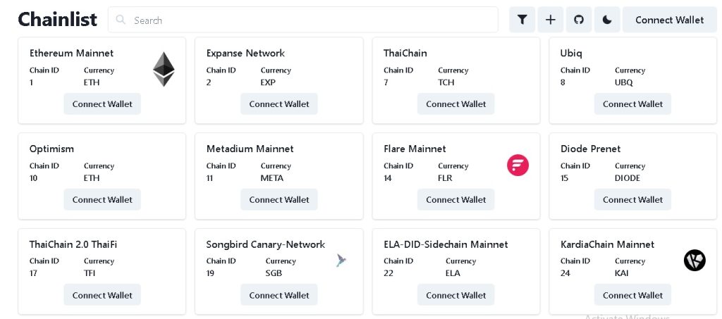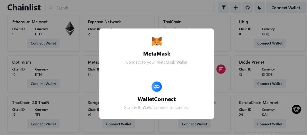 در سایت Chainlist به آسانی از بین شبکههای موجود هر کدام را میخواهید انتخاب کنید و روی گزینه Connect Wallet کلیک کنید.