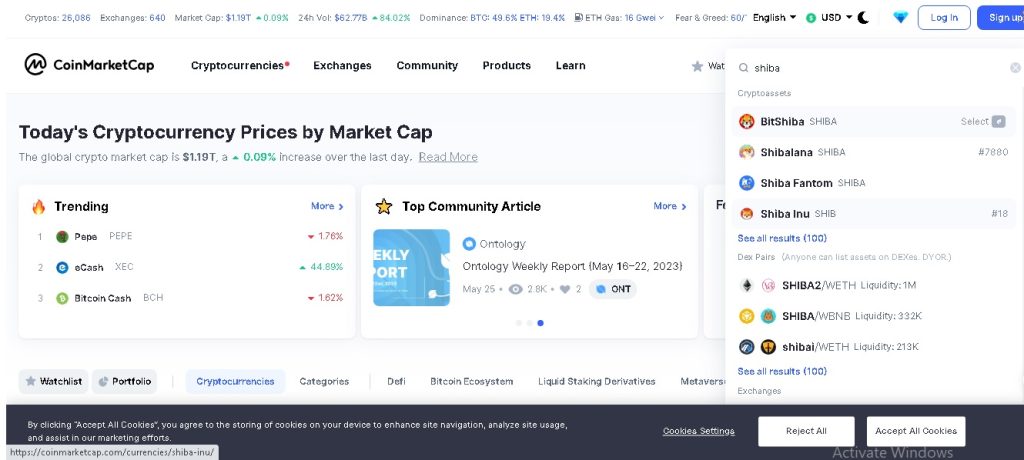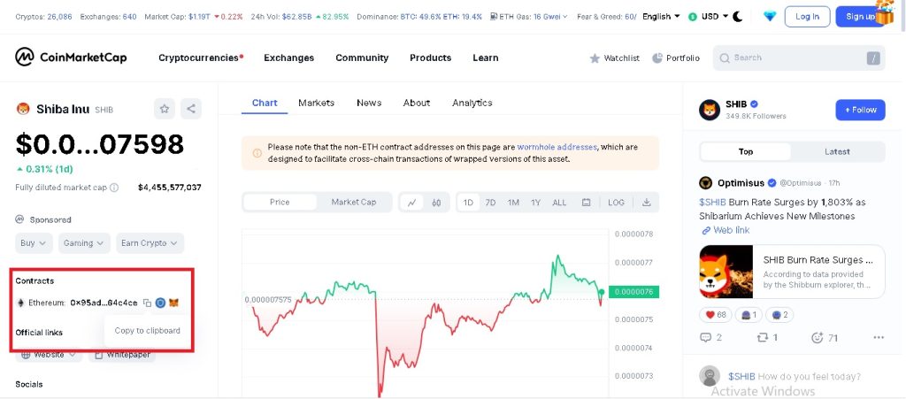 برای اضافه کردن یک توکن دلخواه به کیف پول متامسک ابتدا لازم است وارد یکی از سایتهای کوین مارکت کپ CoinMarketCap یا BscScan شویم تا بتوانیم آدرس توکن مورد نظر خود را از این سایتها به دست آوریم. در این آموزش ما توکن شیبا را به عنوان نمونه به کیف پول متامسک اضافه میکنیم و برای کسب اطلاعات مورد نیاز آن از وبسایت CoinMarketCap استفاده میکنیم.