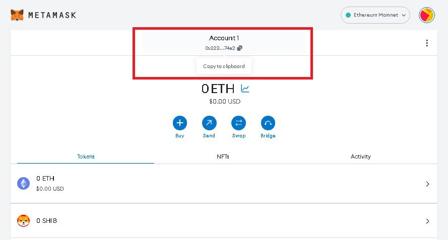 - وارد کیف پول متامسک شده و حساب مورد نظر خود را انتخاب کنید. سپس روی گزینه “Copy to clipboard” کلیک کنید تا آدرس آدرس شما کپی شود.