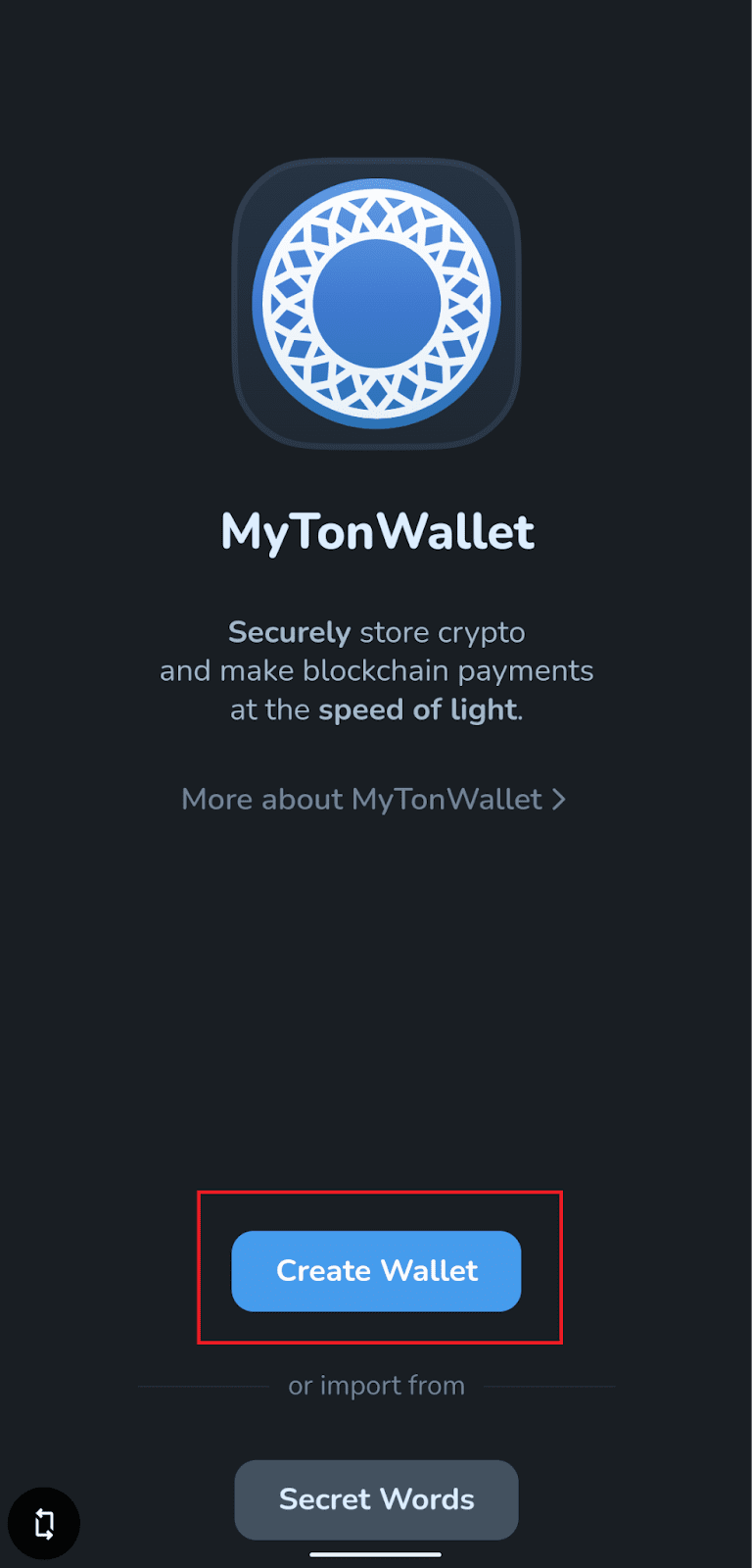 پس از نصب و ورود به کیف پول مای تون ولت، در صفحه اول با دو گزینه مواجه میشوید. برای ساخت یک کیف پول جدید روی گزینه اول، یعنی Create Wallet کلیک کنید. اگر از قبل کیف پول مای تون ولت را داشتید و حالا میخواهید آن را بازیابی کنید، روی گزینه دوم، یعنی Import from Secret Words کلیک کرده و در صفحه بعد عبارت بازیابی ۲۴ کلمهای خود را بهترتیب وارد کنید تا کیف پول قدیمی شما بازیابی شود.