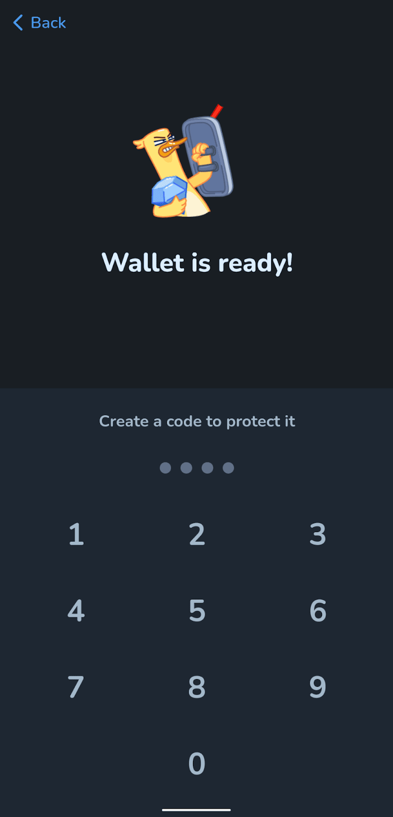 در صفحه بعد باید یک رمز عبور ۴ رقمی برای کیف پول مای تون ولت تعیین کنید. این رمز عبور، رمز دسترسی به حساب شماست که در هر بار ورود به کیف پول باید آن را وارد کنید. دقت کنید که این رمز عبور با عبارت بازیابی ۲۴ کلمهای متفاوت است.