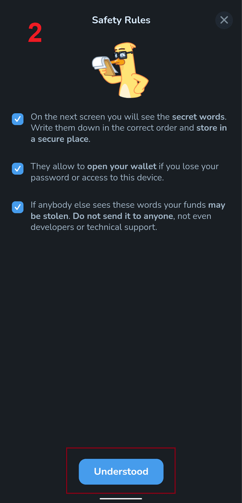 پس از تعیین رمز عبور ۴ رقمی، به صفحه بک آپ منتقل میشوید. در این مرحله یک عبارت بازیابی ۲۴ کلمهای به شما داده میشود تا در صورت فراموشی رمز عبور، پاک شدن نرمافزار و یا از دست رفتن کیف پول به هر دلیلی، بتوانید کیف پول خود را بازیابی کنید. ابتدا روی گزینه Backup کلیک کنید. در صفحه بعد، کل توضیحات امنیتی عبارت بازیابی را تیک بزنید و روی Understood کلیک کنید.