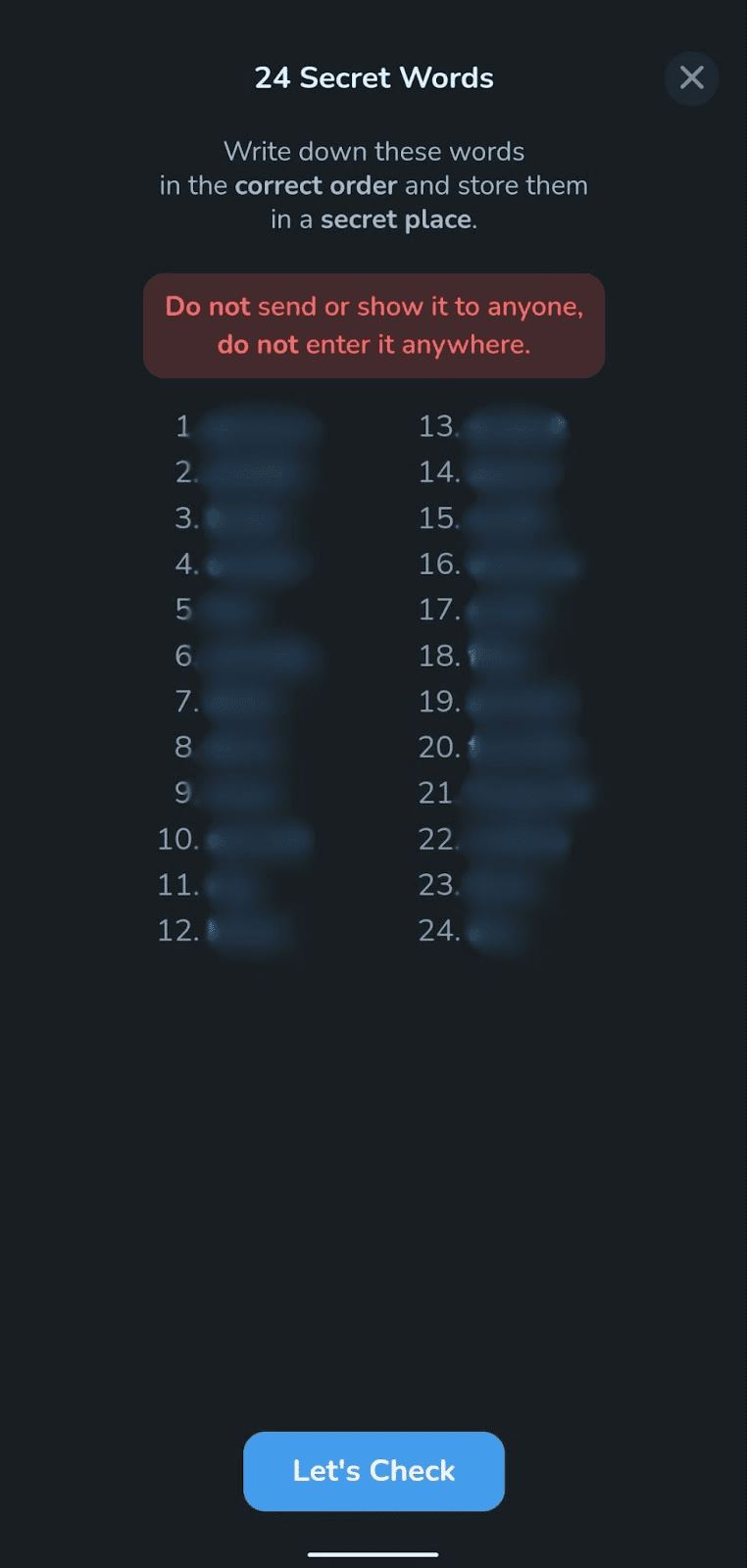 عبارت بازیابی را یادداشت کرده و گزینه Let’s Check را انتخاب کنید. در صفحه بعد ۳ کلمه از عبارت بازیابی بهصورت تصادفی از شما پرسیده میشود. پس از وارد کردن این ۳ کلمه، روی Continue کلیک کنید تا فرایند بک آپ کیف پول تکمیل شود.