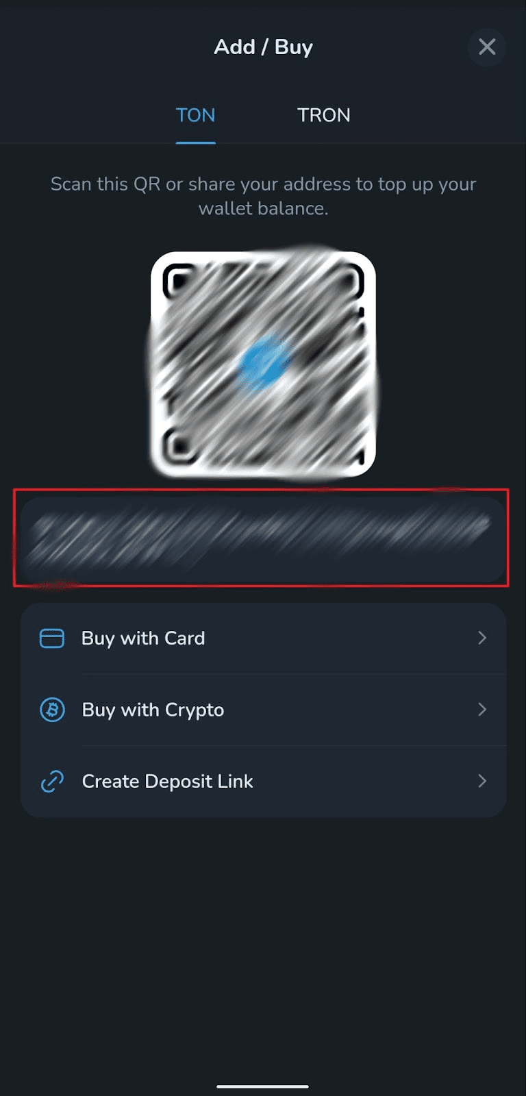 در صفحه اول کیف پول مای تون ولت اولین گزینه از سمت چپ، یعنی گزینه Add/Buy، مربوط به واریز ارز دیجیتال به کیف پول است. برای واریز ارز دیجیتال به مای تون ولت، ابتدا شبکه موردنظر خود (ترون یا تون) را از بالای صفحه انتخاب کرده و سپس با لمس کردن آدرس، آدرس کیف پول خود را کپی کنید. در بالای آدرس، کد QR هر شبکه نیز به شما نشان داده میشود که هنگام واریز ارز دیجیتال از صرافی و یا انتقال ارز دیجیتال به مای تون ولت میتوانید آن را اسکن کنید.