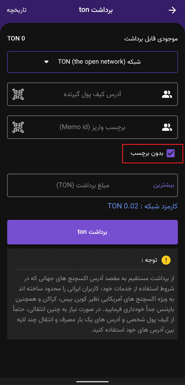 واریز ارز دیجیتال به کیف پول مای تون ولت با شبکه تون نیاز به کامنت یا ممو (Memo) ندارد؛ در نتیجه اگر میخواهید ارزهای دیجیتال خود را با شبکه تون از صرافی نوبیتکس به کیف پول مای تون ولت ارسال کنید، آدرس کیف پول مای تون ولت را وارد و تیک گزینه «بدون کامنت» را مطابق تصویر زیر فعال کنید.
