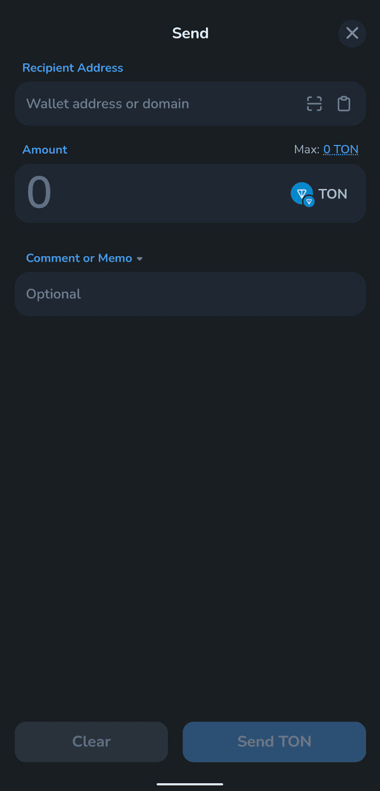 برای برداشت ارز دیجیتال از مای تون ولت به بخش Send بروید. در کادر اول (Recipient Address) باید آدرس گیرنده را وارد کنید. با انتخاب آیکونهای کنار کادر، میتوانید آدرس کپیشده را جایگذاری و یا کد QR را اسکن کنید. در کادر دوم (Amount) مقدار توکنی که قصد برداشت آن را دارید وارد کنید. کادر آخر جهت وارد کردن کامنت یا ممو است که بسته به گیرنده، ممکن است نیاز باشد. برای برداشت ارز دیجیتال از مای تون ولت، باید کمی کارمزد در قالب ارز دیجیتال TON پرداخت کنید.