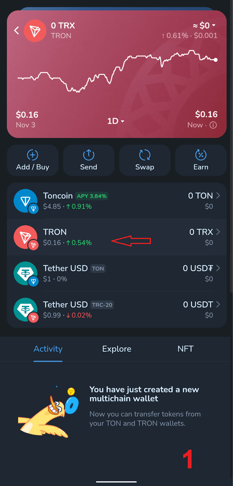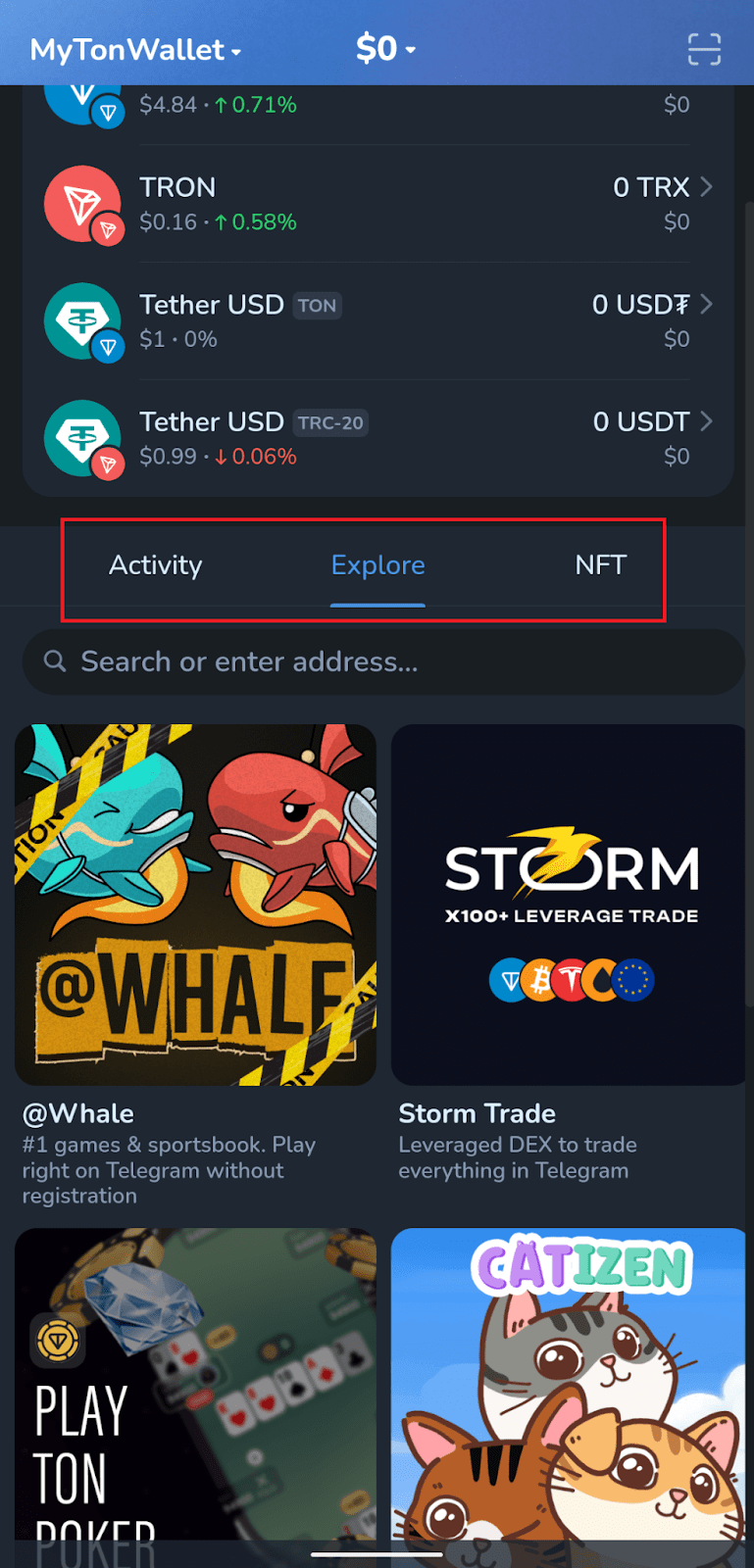 در صفحه اول کیف پول مای تون ولت میتوانید آدرسها (شبکههای ترون و تون)، موجودی توکنها و NFTهای خود را ببینید. از سه بخش پایین صفحه اول، بخش Activity مربوط به تاریخچه تراکنشها و فعالیتهای شما در کیف پول است. در بخش Explore نیز مینی اپهای معروف شبکه تون معرفی شدهاند که میتوانید با کیف پول خود به آنها متصل شوید.