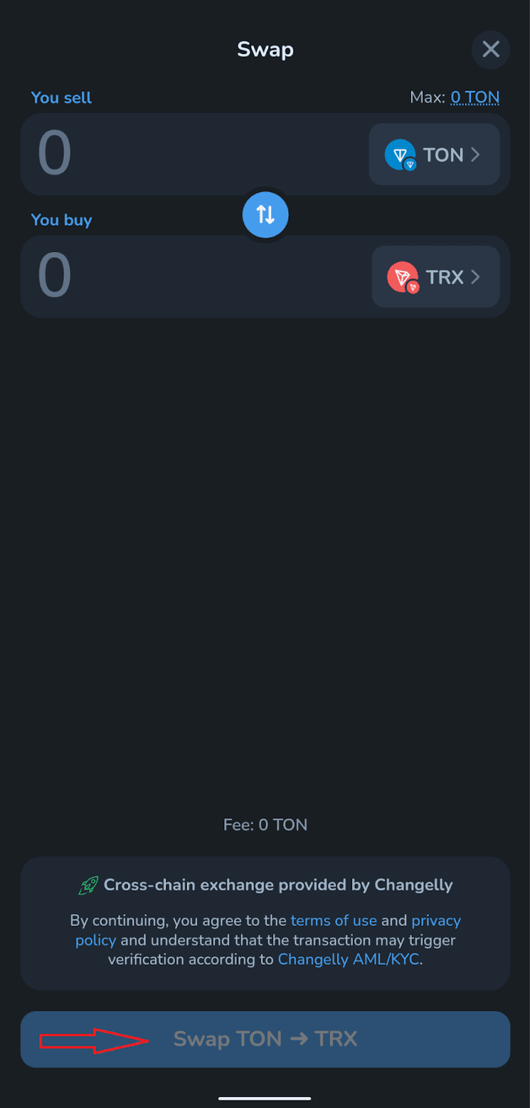 در بخش سواپ (Swap) میتوانید ارزهای دیجیتال مختلف را به یکدیگر تبدیل کنید. تبدیل ارزهای دیجیتال در کیف پول مای تون ولت، از طریق پلتفرم معاملاتی چنجلی (Changelly) انجام میشود. برای تبدیل ارزهای دیجیتال باید مقدار کمی کارمزد در قالب تون کوین پرداخت کنید.