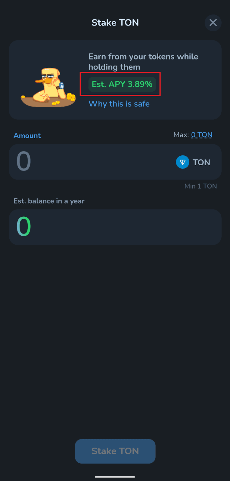 بخش چهارم کیف پول مای تون ولت، بخش Earn است که در آن میتوانید تون کوینهای خود را با یک درصد سود سالانه (APY) مشخص استیک کنید. در حال حاضر، سود سالانه استیک تون کوین در کیف پول مای تون ولت حدود ۳.۸۴ درصد است. برای استیک کردن تون کوین در کیف پول مای تون ولت، مطابق تصویر زیر مقدار تون کوین را مشخص کرده و روی Stake Ton کلیک کنید.