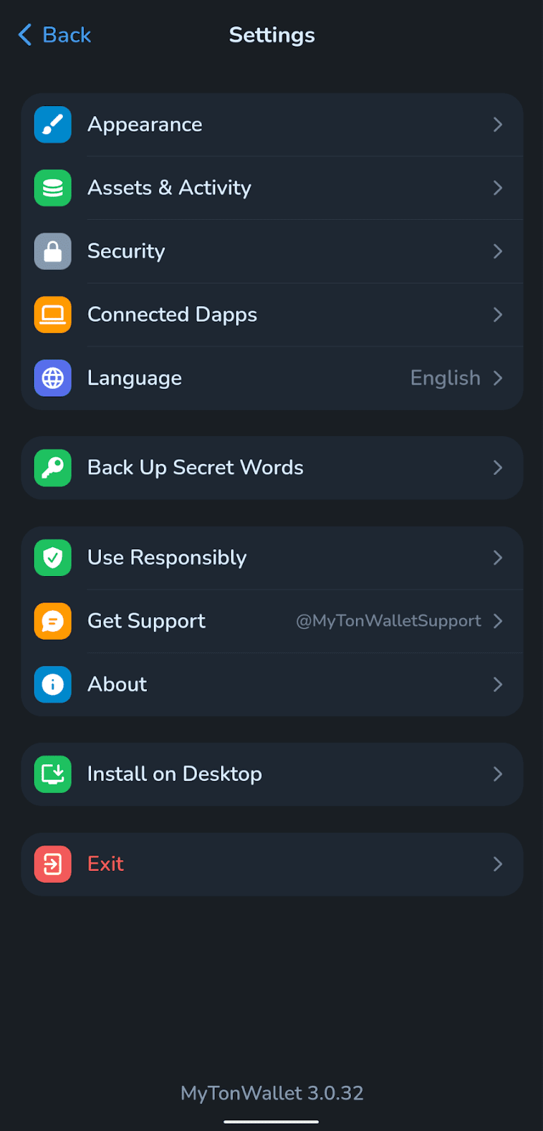 با انتخاب آیکون چرخدنده از گوشه سمت راست بالای صفحه، به صفحه تنظیمات کیف پول مای تون ولت منتقل میشوید. در بخش تنظیمات میتوانید تم کیف پول، ارزهای دیجیتال انتخاب برای نمایش و برنامههای غیرمتمرکز متصلشده به کیف پول را مدیریت کنید. از قسمت Security میتوانید قابلیت ورود به کیف پول با اثر انگشت را فعال کرده و رمز عبور فعلی خود را تغییر دهید.