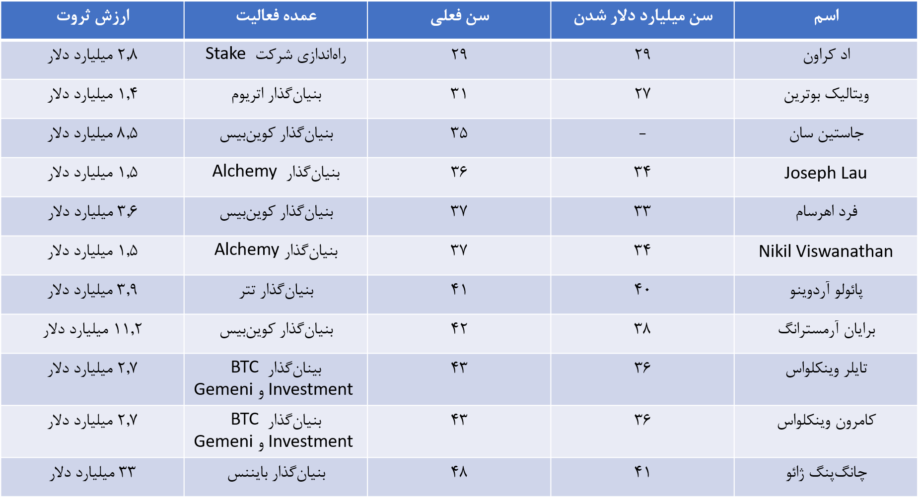 سه چهره جوان دنیای کریپتو (اد کراون، ویتالیک بوترین و جاستین) در جمع میلیاردرهای جهان قرار گرفتهاند.