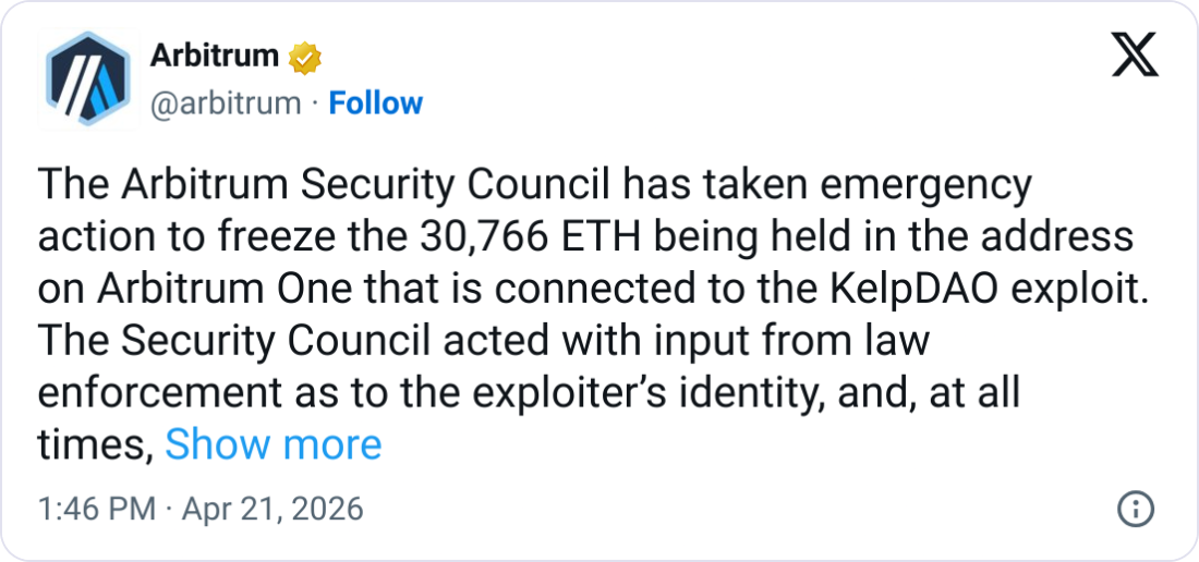 به گزارش کوین تلگراف و کوین تلگراف، شبکه لایه دوم اتریوم یعنی Arbitrum بیش از ۳۰٬۷۶۶ اتریوم (به ارزش حدود ۷۱ میلیون دلار) را در یک کیف پول مرتبط با هک پروتکل Kelp مسدود کرده است. این تصمیم توسط «شورای امنیت Arbitrum» گرفته شد؛ نهادی ۱۲ نفره که با رأی جامعه انتخاب میشود. یکی از اعضا به اسم Griff Green، اعلام کرد این تصمیم با مشورت نهادهای قانونی و پس از بحثهای طولانی فنی، اخلاقی و سیاسی گرفته شده و تصمیم سادهای نبوده است.