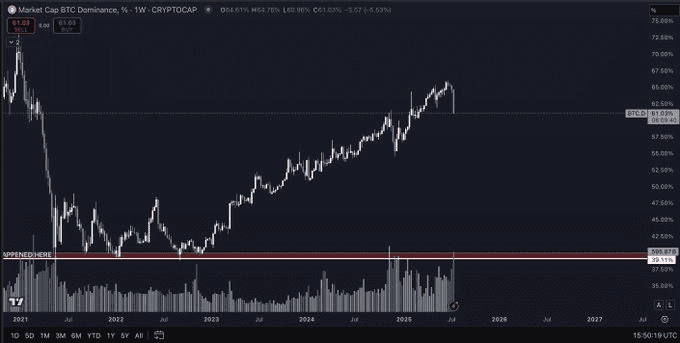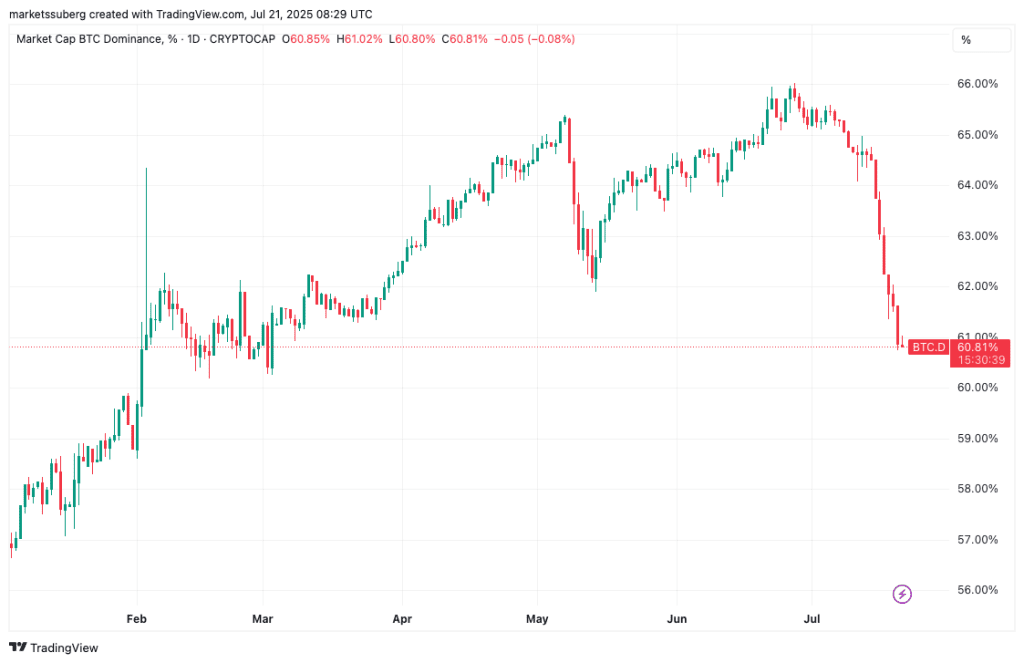 در نتیجهی رشد اتریوم و دیگر آلت کوینها، سهم دامیننس بیت کوین از ارزش کل بازار رمزارزها به شدت کاهش یافته است. این سهم که قبلاً به ۶۶ درصد رسیده بود، در هفته گذشته افت چشمگیری داشته و اکنون به محدوده ۶۰ درصد نزدیک شده است. این پایینترین سطح دامیننس بیت کوین از ماه مارس (اسفند) تا کنون است و برخی کارشناسان میگویند این بزرگترین کاهش دامیننس بیت کوین در چهار سال گذشته است.