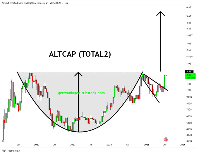 شاخص کلی ارزش بازار آلت کوینها (TOTAL2) در آستانه ورود به محدودههای قیمتی جدید است. در این نمودار، تنش زیادی در الگوی چهار سالهی «فنجان و دسته» در حال شکلگیری است.