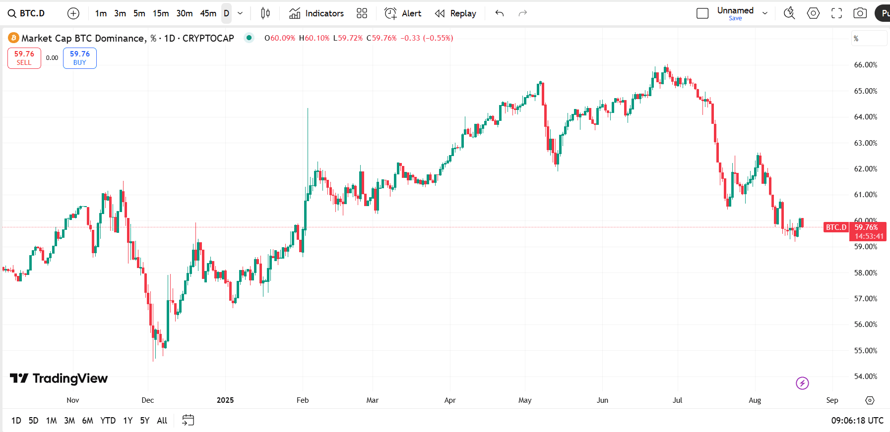 یکی از پدیدههای معمولی که پیش از شروع یک بازار صعودی بزرگ در کریپتو رخ میدهد، کاهش دامیننس بیت کوین است. کوین بیس اشاره کرد که سهم بیت کوین از بازار از ۶۵ درصد در ماه می (اردیبهشت) به کمتر از ۵۸ درصد در آگوست (مرداد) کاهش یافته است. همزمان، ارزش کل بازار آلت کوینها از جولای (تیر) تاکنون بیش از ۵۰ درصد رشد کرده و به ۱.۴ تریلیون دلار رسیده است.