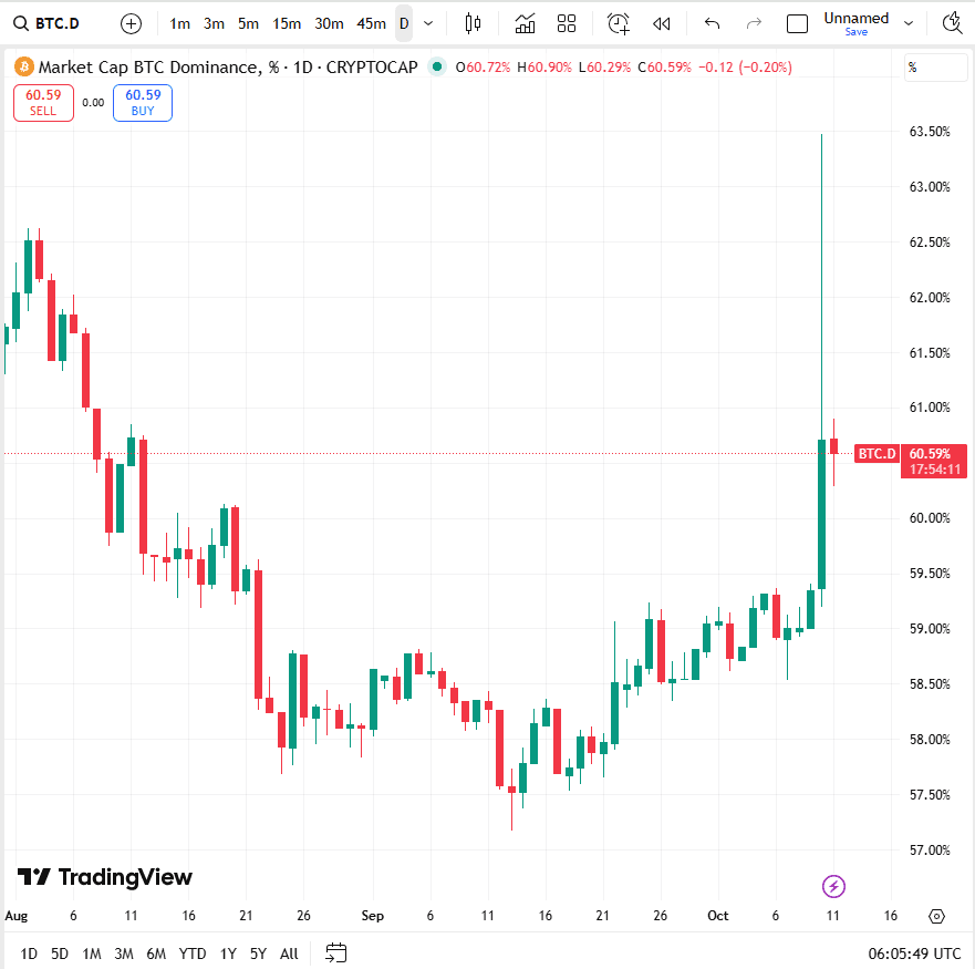 به گزارش بیت کوین سیستمی، شب قبل قیمت بیت کوین تا مرز ۱۰۲٬۰۰۰ دلار سقوط کرد ولی بعد از مدتی توانست دوباره به بالای ۱۱۰٬۰۰۰ دلار برگردد. نکته جالب این است که دامیننس بیت کوین همچنان بیش از ۶۱ درصد است. با این حال فقط حدود ۲۵ درصد از کل لیکوییدیشنهای دیروز مربوط به آن بوده است. به عبارت دقیقتر حدود ۵ میلیارد دلار از ۱۹.۳ میلیارد دلار معامله لیکوییدشده در بازار بیت کوین بوده است.
