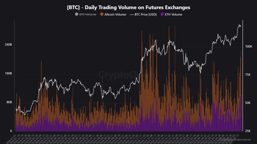 آلت کوین‌ها با حجم معاملات سنگینی مواجه شدند و حجم معاملات بازار فیوچرز آنها به بالاترین سطح چندماهه رسید. حجم معاملات فیوچرز برای ETH و دیگر آلت کوین‌ها به ۲۲۳.۶ میلیارد دلار رسید؛ سطحی که در پنج ماه گذشته مشاهده نشده بود.