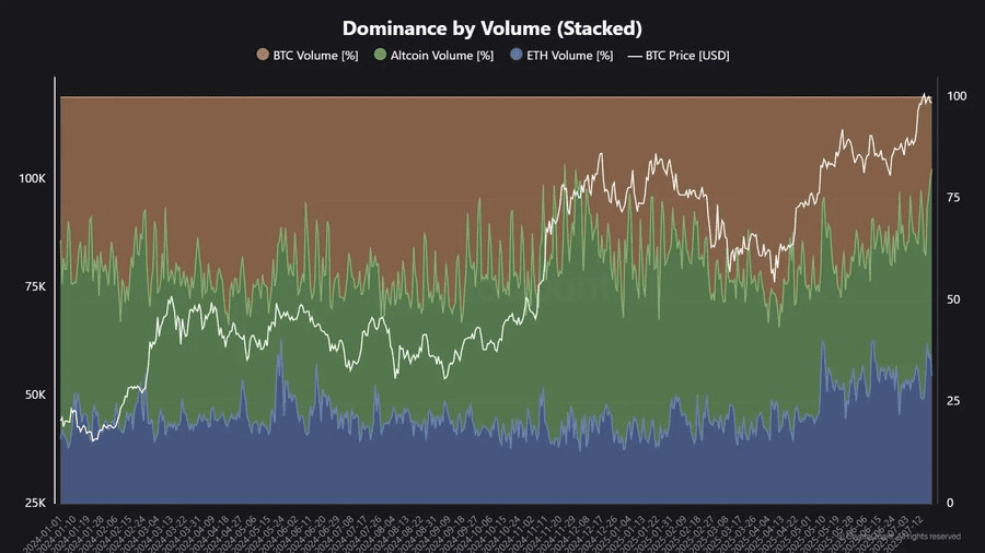 در حالی که آلت کوین‌ها توجه بازار را به خود جلب کردند و بیت کوین زیر سطح ۱۲۰٬۰۰۰ دلار در حال نوسان بود، سهم بازار بیت کوین یا همان دامیننس آن نیز کاهش یافت. دامیننس بیت کوین به حدود ۵۸ درصد رسید، در حالی که چند ماه پیش این عدد ۶۱ درصد بود.