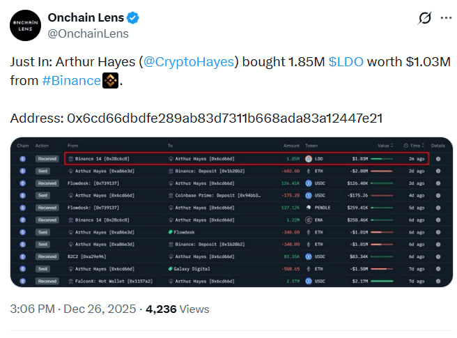 آرتور هیز با خرید ۱.۸۵ میلیون توکن LDO از بایننس، توجهها را در بازار ارزهای دیجیتال به خود جلب کرد.
