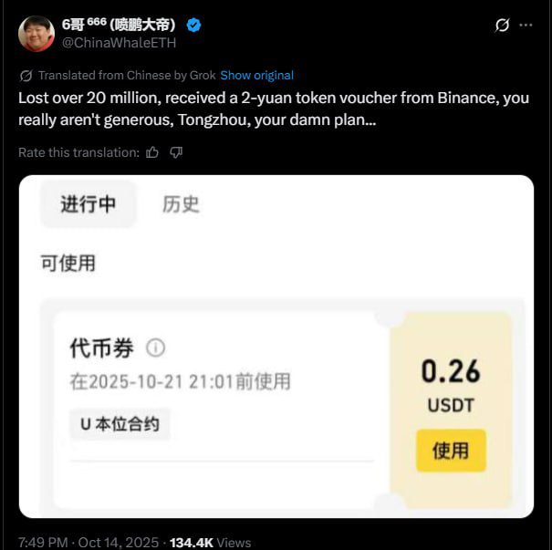 هم‌زمان، بایننس با خشم کاربران روبه‌رو شده‌ است. یکی از تریدرهایی که در سقوط ناگهانی بازار ۲ میلیون دلار ضرر کرد، تنها یک کوپن ۰.۲۶ دلاری به‌عنوان خسارت دریافت کرد!