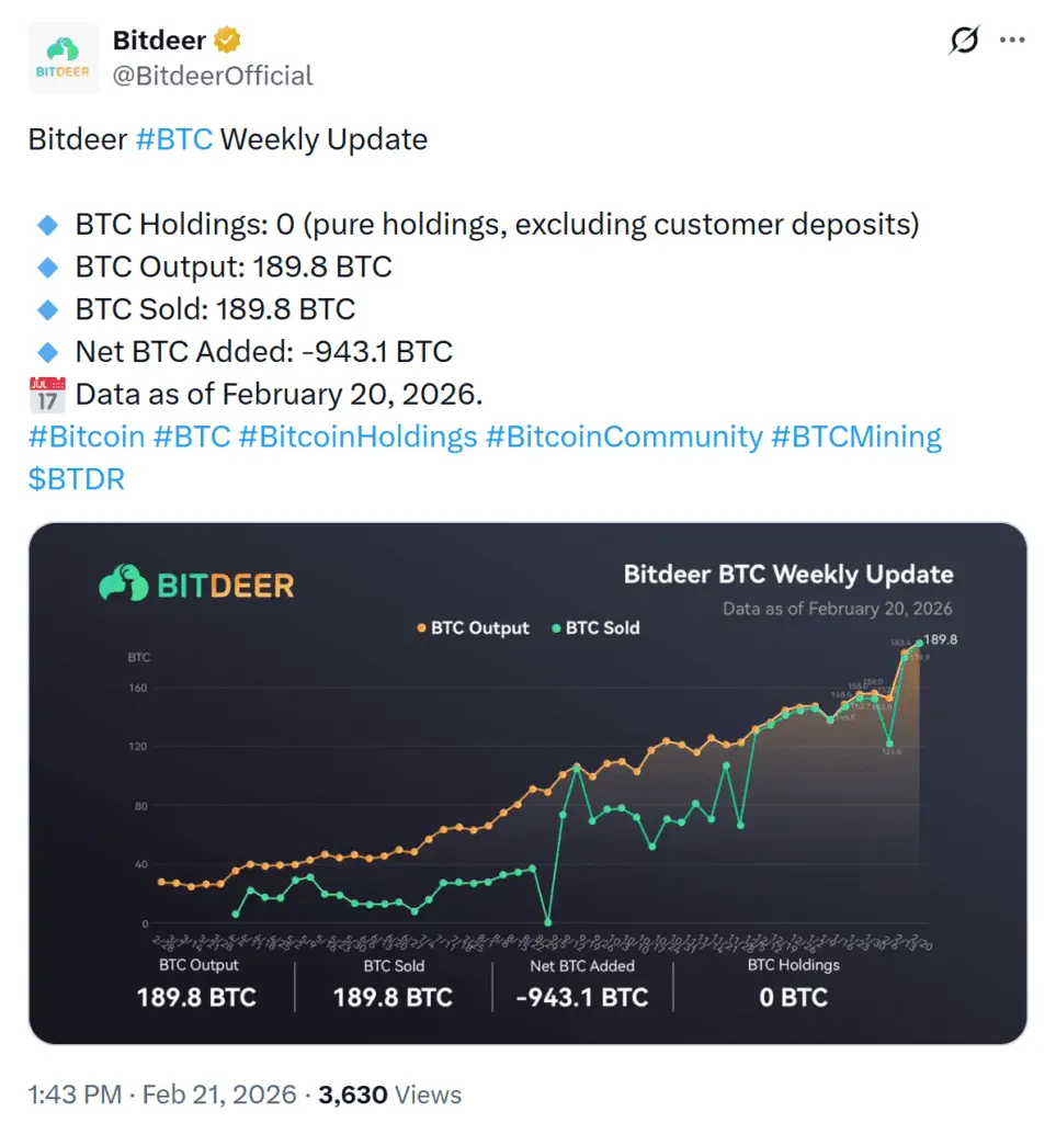در جدیدترین گزارش هفتگی خود، Bitdeer اعلام کرد که «دارایی خالص» آن (بدون احتساب سپرده‌های مشتریان) به ۰ بیت کوین (BTC) رسیده‌ است. این گزارش نشان می‌دهد که شرکت مذکور در این دوره ۱۸۹.۸ BTC تولید کرده و تمام این مقدار را فروخته‌ است. علاوه بر آن، ۹۴۳.۱ بیت کوین دیگر را نیز از خزانه خود خارج کرده است.