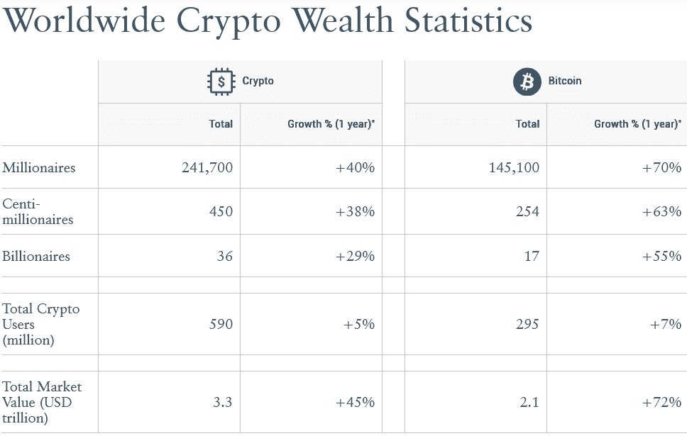 این در حالی است که تعداد میلیاردرها ۵۵ درصد رشد کرد و به ۱۷ نفر رسید. فیلیپ باومن از Z۲۲ Technologies، بیان کرد که بخشی از این رشد را میتوان به تبدیل بیت کوین به «ابزاری برای انباشت ثروت» نسبت داد. با وجود این، پذیرش کلی ارزهای دیجیتال تنها ۵ درصد افزایش یافت و به ۵۹۰ میلیون نفر رسید.