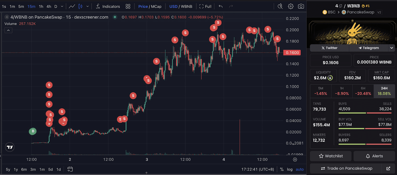 میم کوین ۴ سومین توکن پرخریدار توسط معاملهگران پول هوشمند طی ۲۴ ساعت گذشته در زنجیره BNB بوده است. به طوری که معاملهگران نزدیک به ۱۰۰,۰۰۰ دلار از این توکنها را خریداری کردهاند.