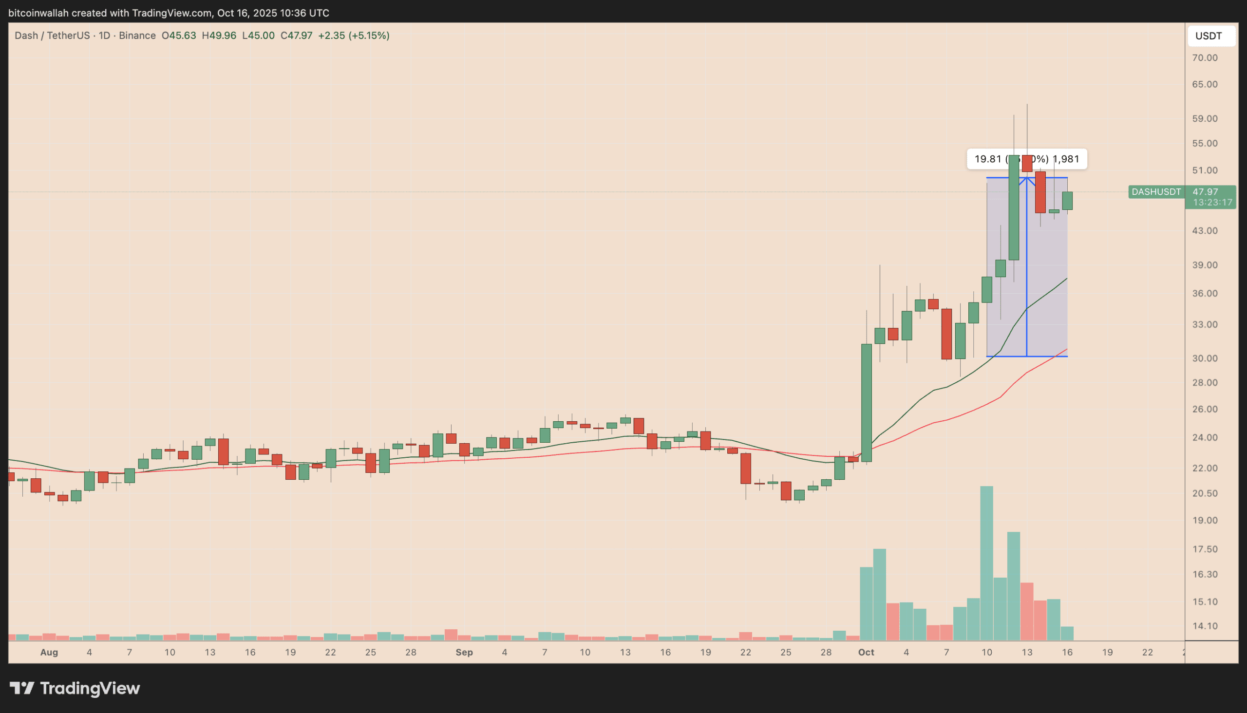 DASH از زمان سقوط بازار بیش از ۶۵ درصد رشد کرد و تا روز پنجشنبه با تقریباً ۵۰ دلار معامله شد. در همین حال، بازده آن در ماه گذشته نزدیک به ۱۵۰ درصد بود.