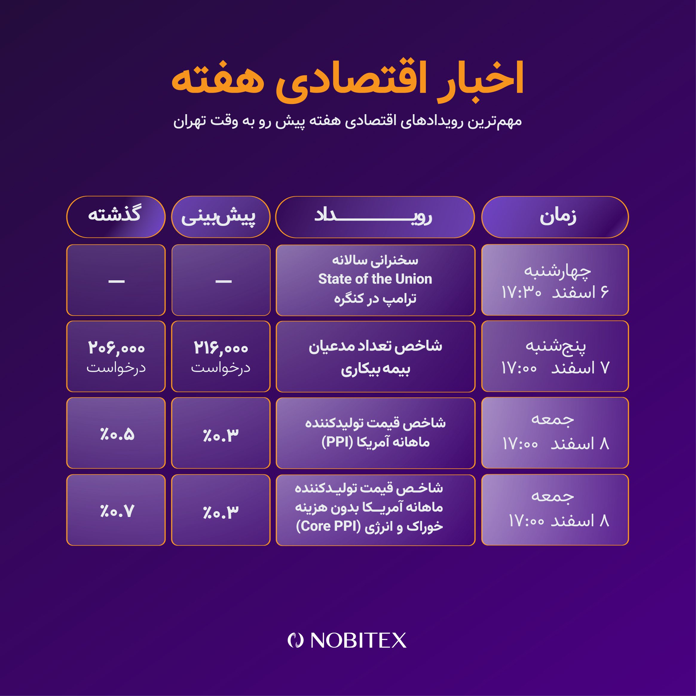 علاوه بر این ساعت ۱۷:۳۰ دونالد ترامپ به عنوان رئیسجمهور ایالات متحده سخنرانی خود در کنگره را ارائه خواهد کرد که اهمیت زیادی برای بازارهای مالی دارد. ساعت ۱۳:۳۰ به وقت تهران هم شاخص قیمت مصرفکننده (CPI) سالانه منطقه یورو منتشر میشود (پیشبینی: ۱.۷ درصد، قبلی:۱.۷ درصد).