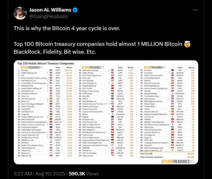 شرکتهای برتر دارای ذخایر بیت کوین، در مجموع نزدیک به ۱ میلیون بیت کوین دارند و به همین دلیل چرخههای چهار ساله بیت کوین پایان یافته است.