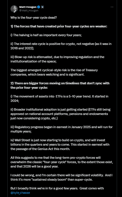 تمام این موارد به من نشان میدهد که نیروهای بلندمدت حامی کریپتو، بر نیروهای کلاسیک چرخه چهار ساله (تا جایی که چنین چرخهای وجود داشته باشد) غلبه خواهند کرد و سال ۲۰۲۶ سال خوبی خواهد بود.
