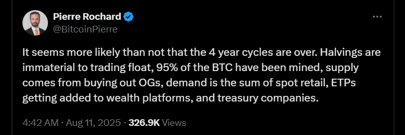 با این حال، همه با این نظر موافق نیستند. تحلیلگر کریپتو با نام «CRYPTOBIRB» میگوید حذف چرخه چهار ساله اشتباه است، چون ETFها حتی این چرخه را قویتر کردهاند.