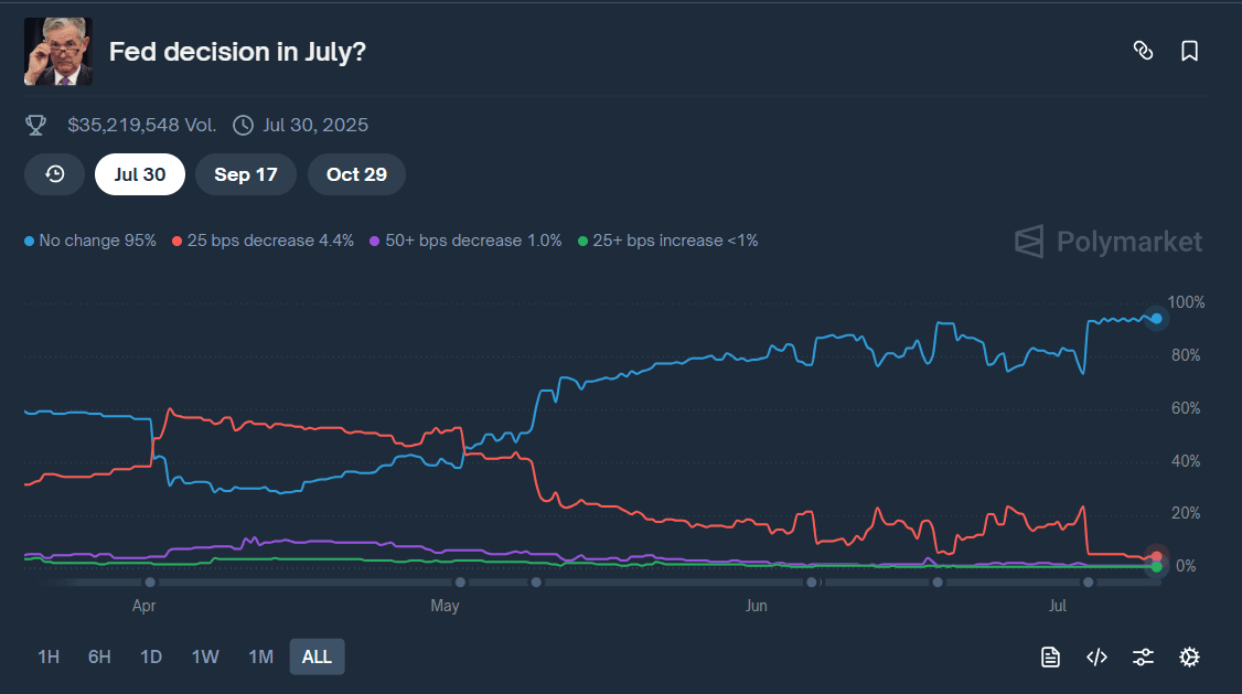 با وجود صحبتهای والر، دادههای Polymarket نشان میدهد که احتمال کاهش نرخ بهره در نشست پیش رو تنها ۵ درصد است.