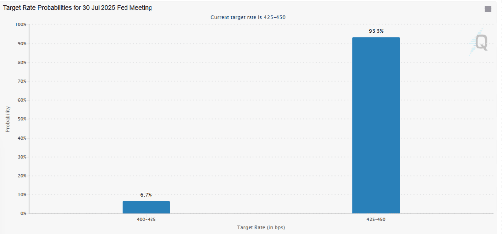 همچنین، اطلاعات پلتفرم CME FedWatch نیز احتمال ثبات نرخ بهره را ۹۳.۳ درصد تخمین میزند.