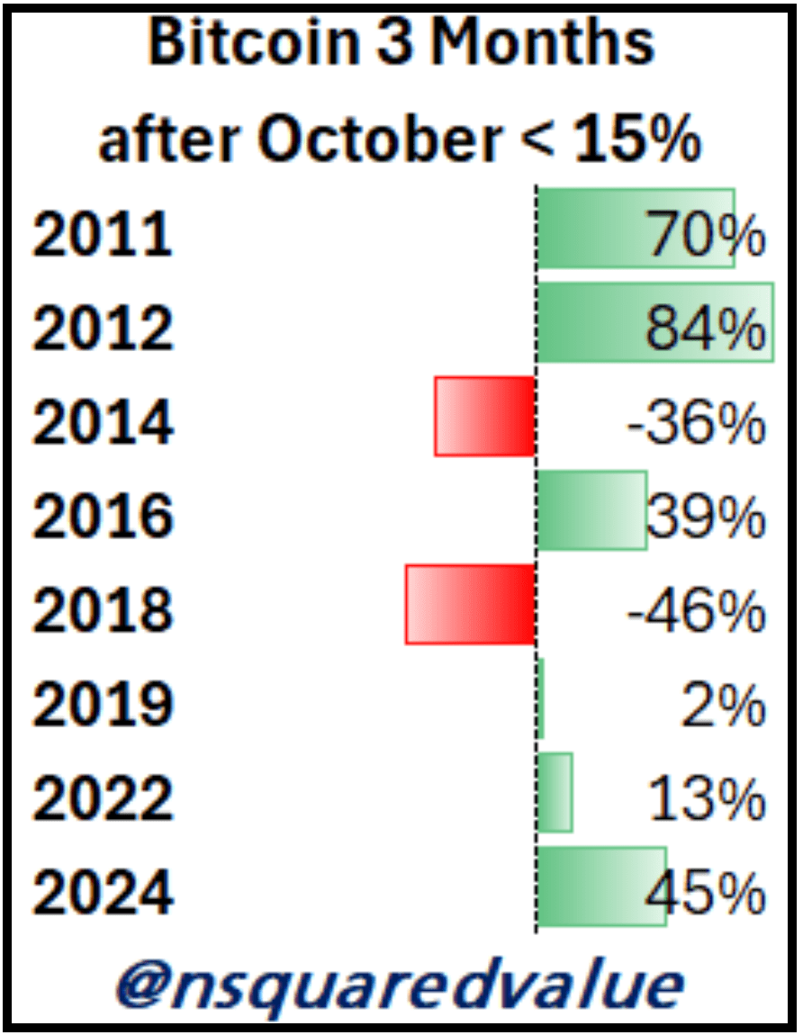 آخرین بار که اکتبر قرمز بود، یعنی ۲۰۱۸، در نوامبر بیتکوین ۳۶.۵۷ درصد سقوط کرد. بااینحال، «تیموتی پیترسون» میگوید بین عملکرد اکتبر و ماههای بعد ارتباطی وجود ندارد، هرچند معمولاً رشد سهماههی چهارم بعد از اکتبر ضعیف، حدود ۱۱ درصد است، درحالیکه پس از اکتبر قوی، میانگین رشد به ۲۱ درصد میرسد.
