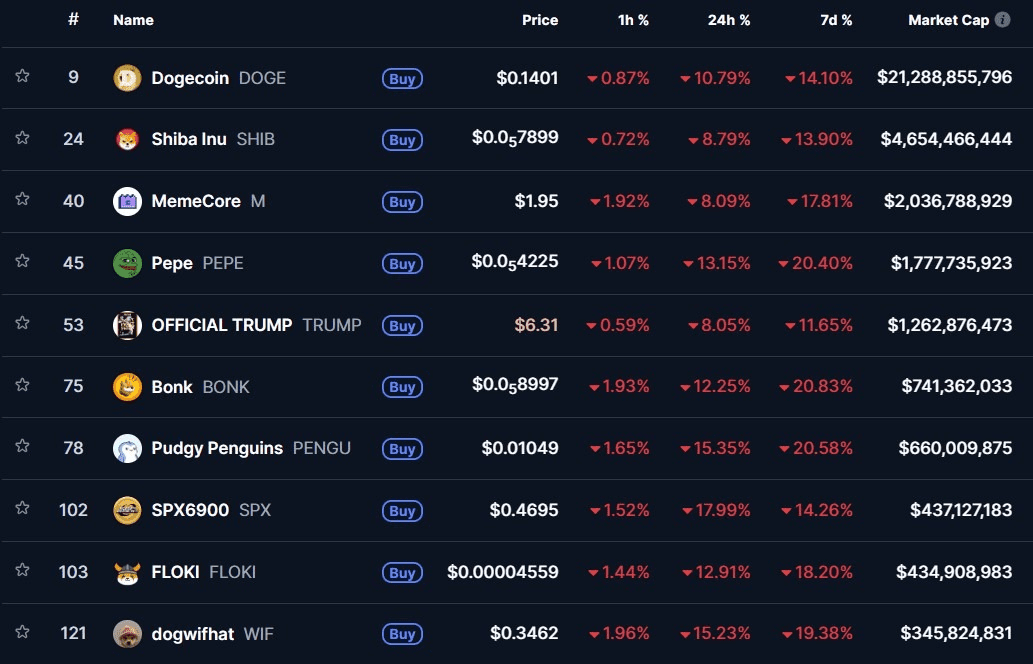 بزرگترین میم کوینها از جمله قیمت دوج کوین (DOGE) و قیمت شیبا اینو (SHIB)، زیانهای دو رقمی را ثبت کردند. در حالی که توکنهایی مانند قیمت پپه (PEPE)، قیمت بونک (BONK) و قیمت فلوکی (FLOKI) کاهشهای شدیدتری را تجربه کردند.