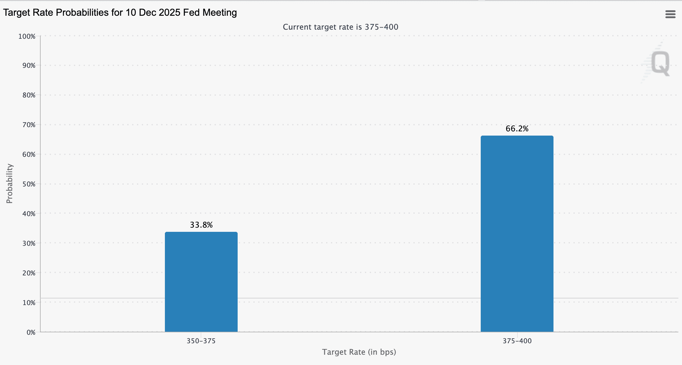احتمال کاهش نرخ بهره فدرال رزرو در دسامبر از ۶۷ به ۳۳ درصد سقوط کرده و همین موضوع همراه با ترس شدید بازار باعث ریزش بیت کوین به زیر ۸۹٬۰۰۰ دلار شده است.