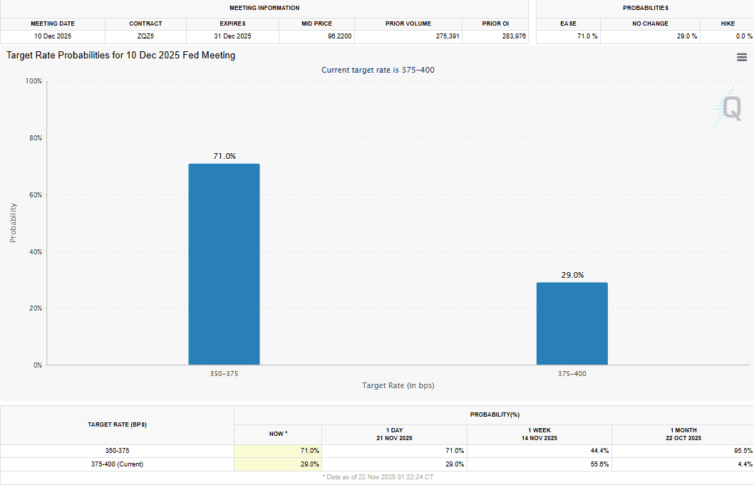 دادههای CME FedWatch نشان میدهد که بیش از ۷۰ درصد احتمال دارد فدرال رزرو در ۱۰ دسامبر (۱۹ آذر) نرخ بهره را ۰.۲۵ درصد کاهش دهد. در این صورت نرخ بهره از محدوده ۴.۰۰ تا ۳.۷۵ درصد به ۳.۷۵ تا ۳.۵۰ درصد میرسد. بسیاری باور دارند این اتفاق برای بیت کوین خوب است.