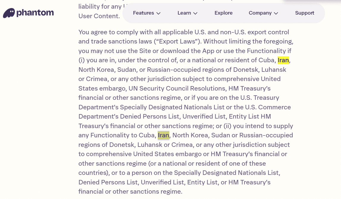 کیف پول فانتوم، یکی از محبوبترین کیف پولهای غیرحضانتی در اکوسیستم سولانا، در قوانین خود اعلام کرده که ارائه خدمات به برخی کشورها ممکن است با محدودیت همراه باشد. با این وجود، بعضی از کاربران ایرانی همچنان با استفاده از ابزارهایی مانند VPN به نسخه وب یا افزونه مرورگر این کیف پول دسترسی پیدا کرده و داراییهای خود را مدیریت میکنند.