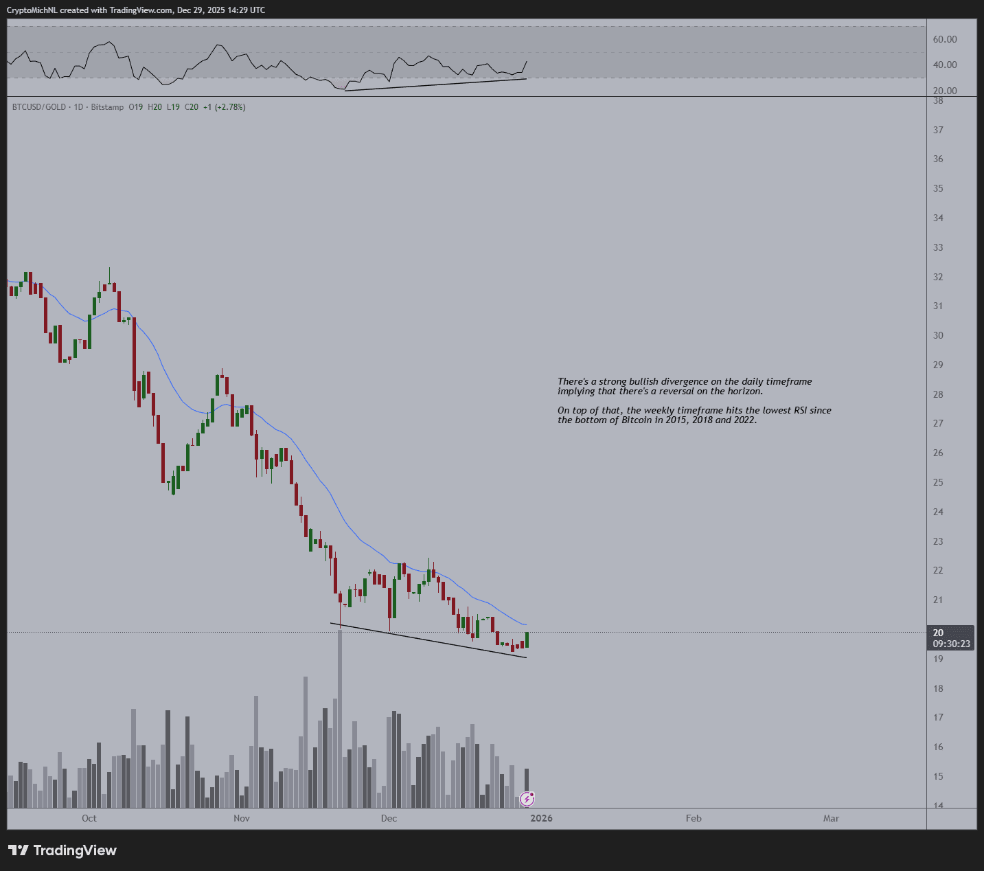 در پستی جداگانه، ون دو پوپه یک واگرایی صعودی را در نمودار روزانه BTC/GOLD مشاهده کرد که نشان میدهد بیت کوین احتمالاً در دوره پیش رو عملکرد بهتری نسبت به طلا خواهد داشت. او ادامه داد: