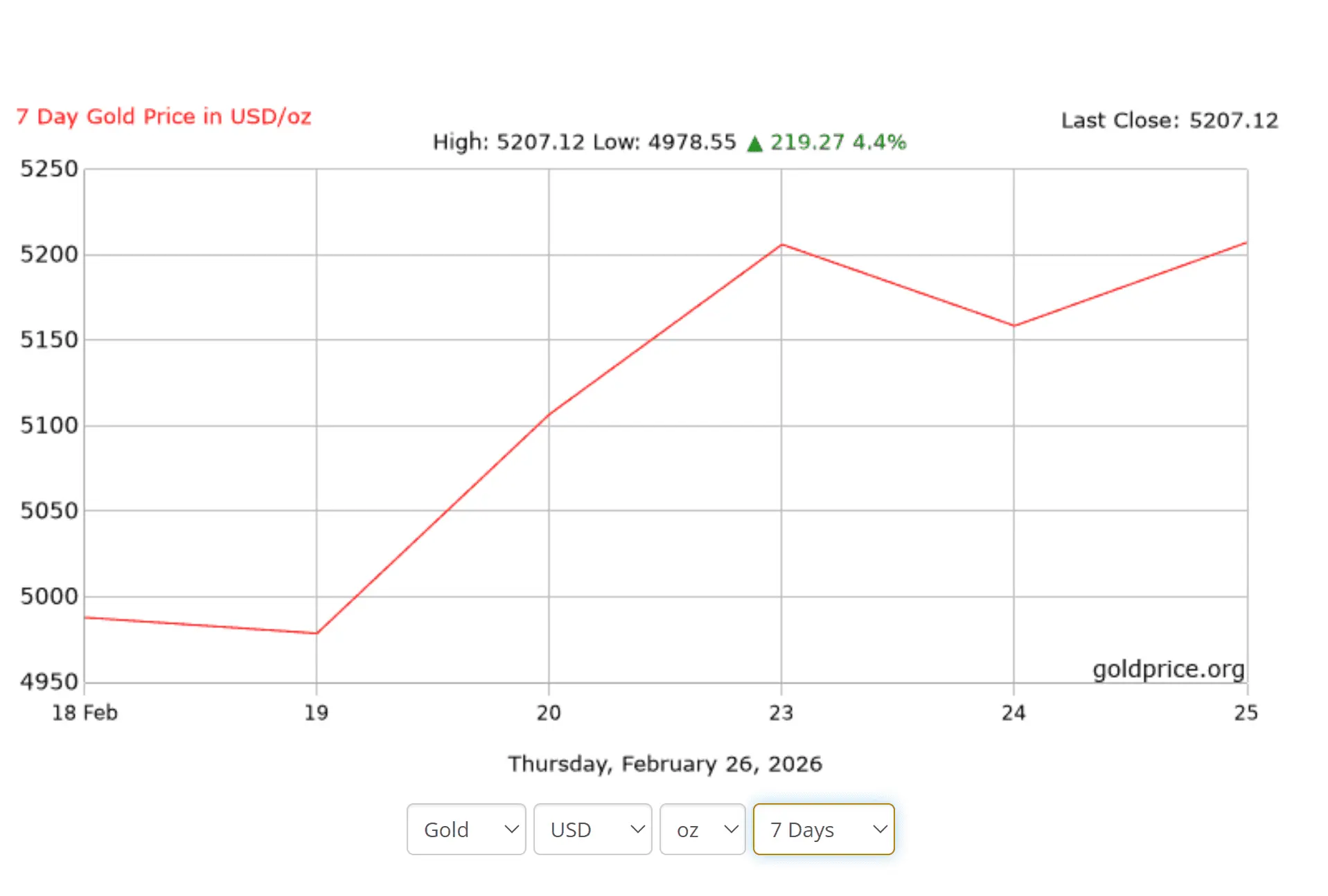 طلا در حال حاضر با قیمت حدود ۵,۱۷۲ دلار در هر اونس معامله میشود که اندکی نسبت به روز قبل کاهش یافته است. با این حال، طی هفته گذشته قیمت آن ۲۱۹ دلار (۴.۴ درصد) افزایش یافتهاند.