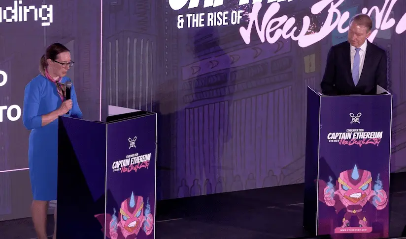 هستر پیرس (چپ) و پل اتکینز (راست) از SEC. منبع: ETHDenver