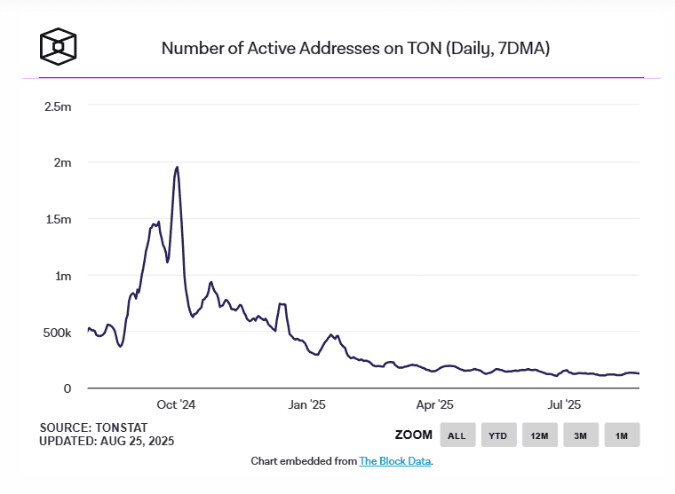 برای مثال تعداد آدرسهای فعال روی شبکه TON پس از بازداشت دوروف افزایش یافت. البته بعد از رسیدن به اوج خود، فعالیتش کمی کاهش یافته است.