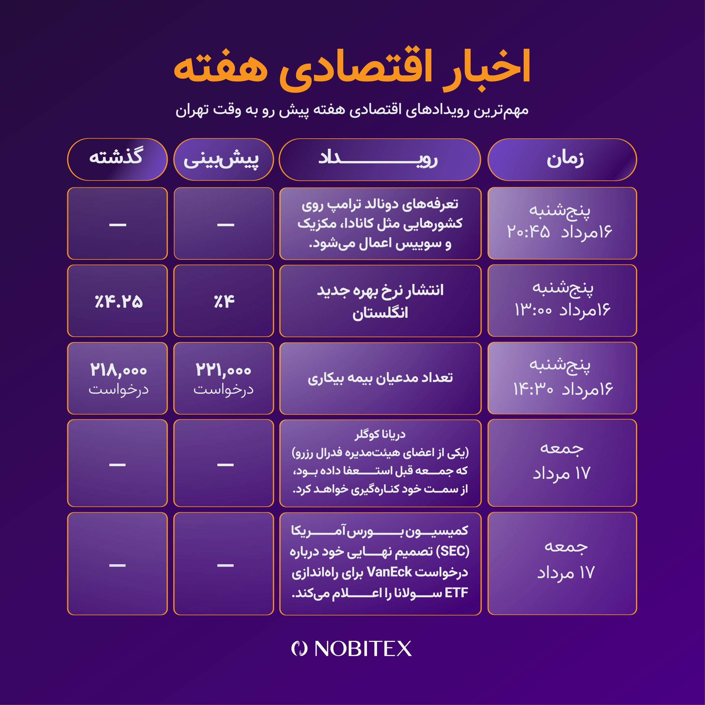 • بازار ارزهای دیجیتال پس از افت هفته گذشته، این هفته با رویدادهای مهمی مانند تصمیم‌گیری درباره چند ETF سولانا، عرضه توکن RICE و اعلام نرخ بهره بریتانیا روبروست.