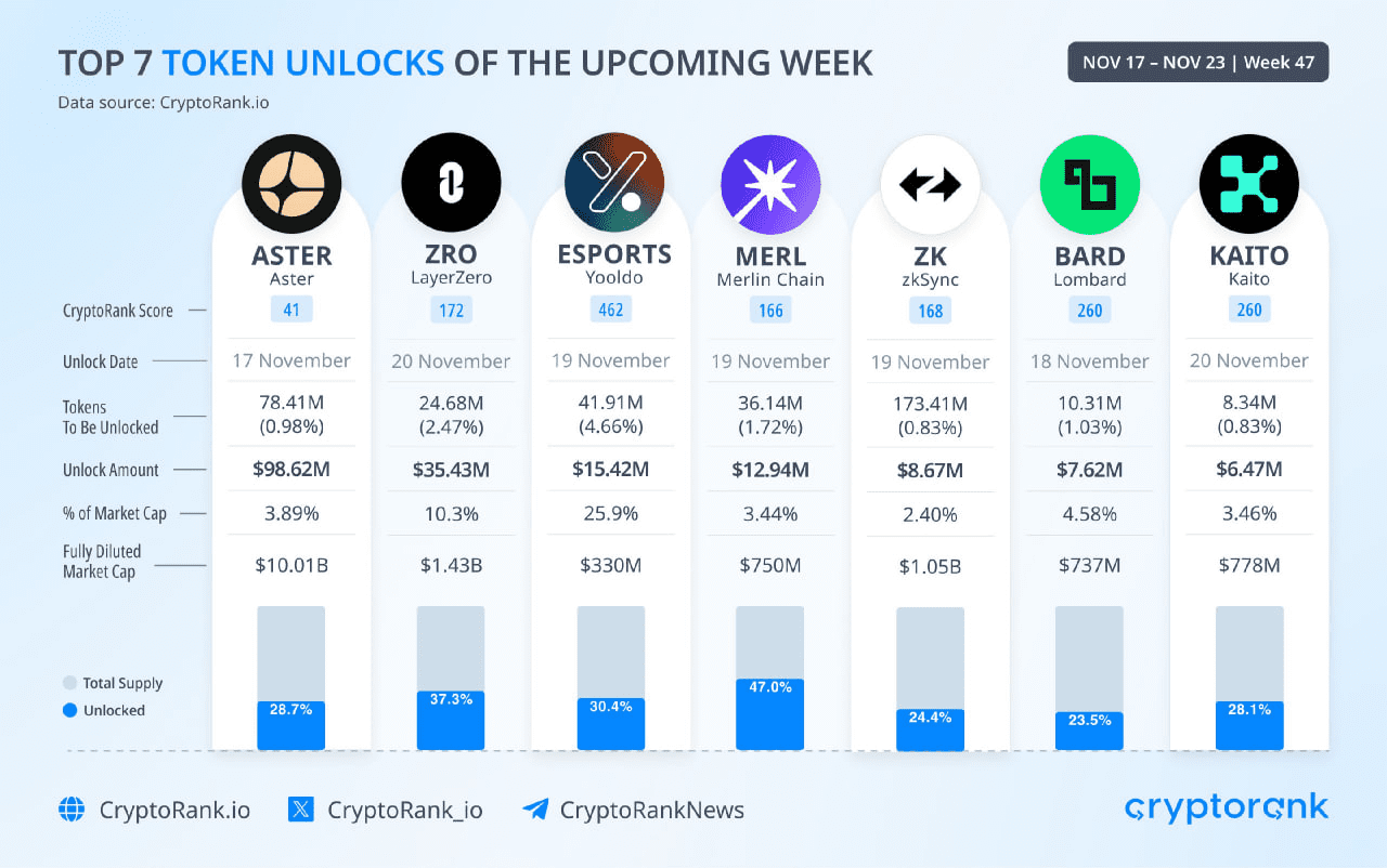 علاوه بر پروژههای بالا، توکن آنلاکهای مهم دیگری که سرمایهگذاران میتوانند در هفته پیش رو به آنها توجه کنند شامل ZKsync (ZK)، KAITO (KAITO)، ApeCoin (APE) و موارد دیگر میشوند که به انتشار گسترده توکنها در بازار کمک میکنند.