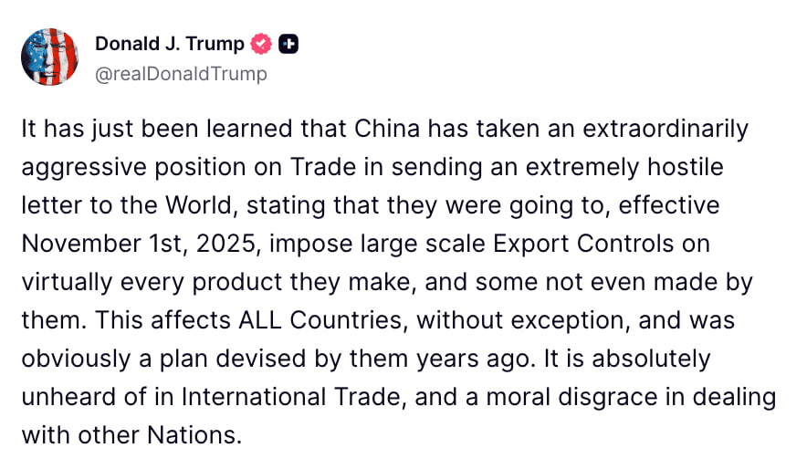 دونالد ترامپ اعلام کرد از اول نوامبر ۲۰۲۵ (۱۰ آبان) تعرفه ۱۰۰ درصدی بر تمام واردات از چین اعمال میکند.