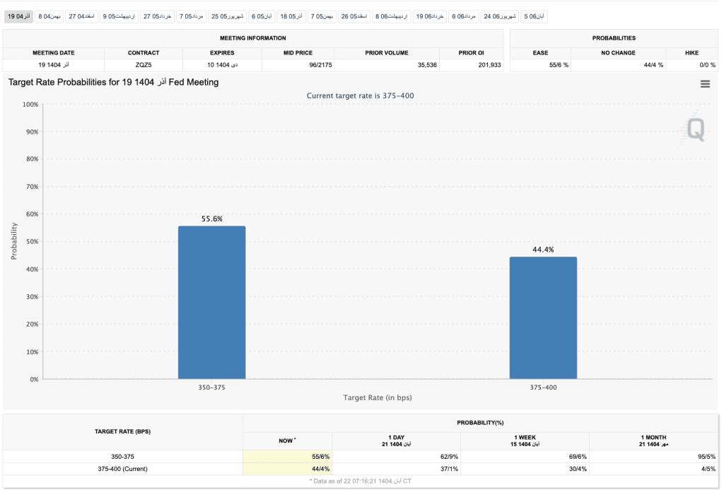 - بازارها همچنان کاهش ۰.۲۵ درصدی را با احتمال ۵۵ درصد پیشبینی میکنند.