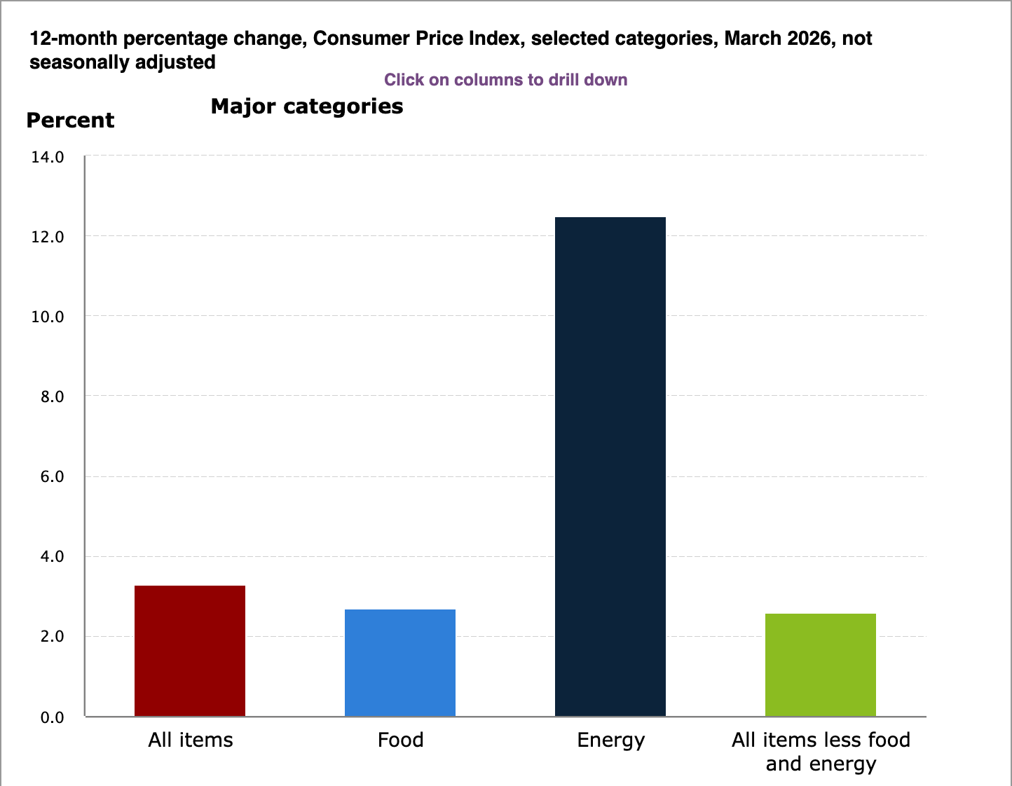 بر اساس گزارش BLS، افزایش شدید قیمت انرژی ناشی از جنگ ایران عامل اصلی ارقام تورمی ماه مارس بوده است؛ بهطوری که شاخص انرژی نزدیک به ۱۱ درصد رشد کرد و این افزایش عمدتاً تحت تأثیر رشد ۲۱.۲ درصدی قیمت بنزین بود.