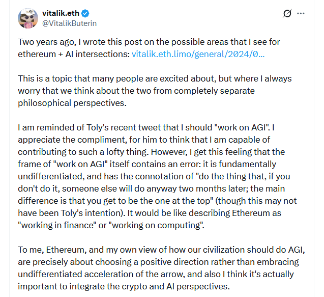 ویتالیک بوترین اعلام کرده است که برای تلاقی اتریوم با هوش مصنوعی، این دو را در کنار یکدیگر برای بهبود بازارها، امنیت مالی و عاملیت انسانی میبیند.